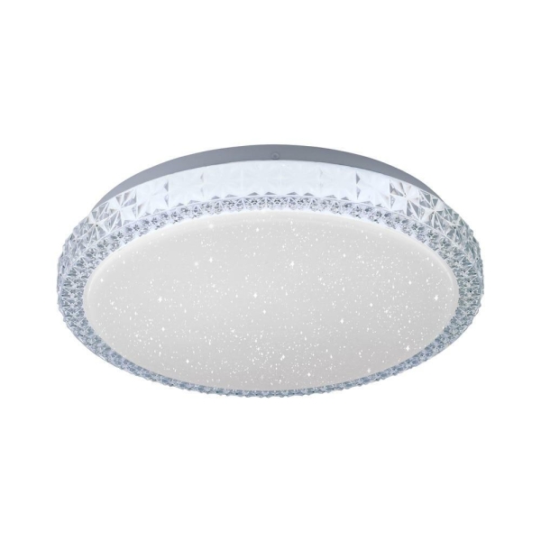 The round ceiling lamp convinces with its fascinating starry sky look. Due to the many small translucent dots in the glass screen, it looks as if small stars are sparkling. The plastic shade of the luminaire looks framed by the transparent structure pattern, which adorns the outer edge. It is supplied including a fixed LED light bulb. In addition, you have the possibility to adjust the colour temperature of the light from warm white to daylight white to your needs and thus simulate the light colours of a daily routine. This is done by repeatedly pressing the switch. The ceiling lamp is versatile and is guaranteed to find a special place in one of your living rooms. Let yourself be enchanted by the beautiful starry sky.