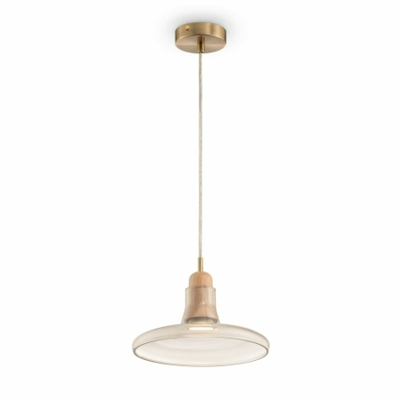 17. Ola Brass With Wood Detail and Amber Glass Shallow Pendant Light
