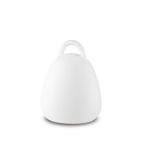 Wireless mobile device with LED sources powered by rechargeable batteries and light colour RGB changing function. Matt white polycarbonate light body-diffuser. 10 hours batteries autonomy.