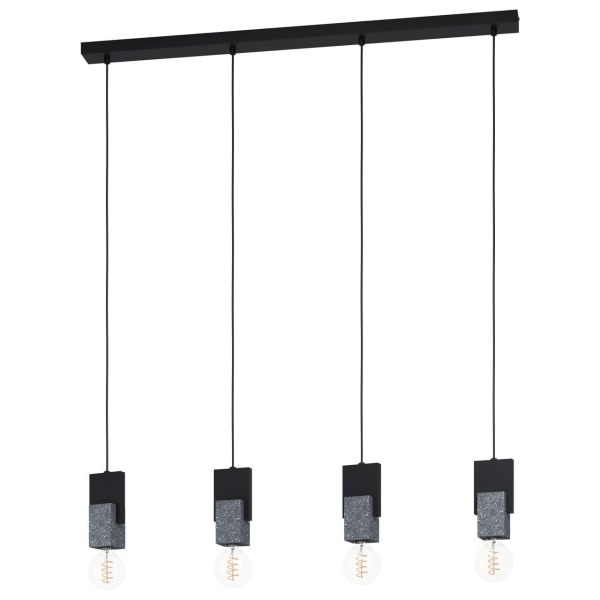 The LOBATIA pendant light features four angular lamp holders made from grey and white speckled terrazzo, each combined with a black wood element. The lamp holders are suspended from a black metal mount. The product has a compelling mix of metal, wood and terrazzo materials and the minimalist pendant light blends perfectly into modern interiors. The product provides stylish lighting for your interior, whether in the living room or over a long table in the dining room. The pictured lightbulbs are not included. The product has E27 lamp holders and requires E27 lightbulbs.