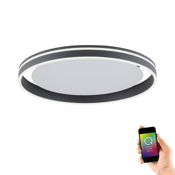 The LED ceiling lamp Q®-VITO in the colour anthracite convinces with its modern design. The white satin-plated stray glass ring skilfully completes the overall image of the design light and releases the light without glare down and sideways. Thanks to the integrated CCT light management, you can individually adjust the colour temperature from warm white to daylight white and thus simulate the light colours of a daily routine. This regulation is done via the supplied Q® remote control. With the wireless remote control, individual luminaires and luminaire groups can be operated, changed in brightness and colour and saved via the memory function. All Q® lights can also be integrated into existing smart home systems based on the ZigBee wireless standard. The Echo Plus* and Echo Show (2nd Gen)* smart speakers already have an integrated Zigbee hub and can communicate directly with our Q® lights. For Echo Dot*, Echo*, Echo Spot*, Echo Show (1st Gen.) *, Google Home** and Google Home mini**, on the other hand, an additional gateway is required. With the connection to a ZigBee-compatible gateway of a third-party provider (e.B. homee etc.), the luminaires can be conveniently controlled via a smartphone, tablet or PC via an associated app. In combination with the Alexa* or Google Home** voice assistants, it is possible to operate the luminaires with voice control, so that phrases such as Alexa, turn on the light will soon be a matter of course for you and increase your comfort and security in your home. *Amazon, Echo Plus and Alexa are trademarks of Amazon Europe S.a r.l and serve only as an indication of the compatibility and usage of our Smart Home Q lights. The products and lights shown are not from Amazon. **Google Home is a trademark of Google and serves only as an indication of the compatibility and usage possibilities of our Smart Home Q lights."